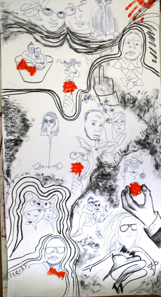 Voor The Big Draw Nijmegen vulde Yette een rol paper met een verzameling tekeningen genaamd ‘I Fink U Freeky’ naar een gelijknamig nummer van de band ‘Die Antwoord.’ Net als deze band speelde ook Yette hier met het idee van ‘freak’-zijn. Of spelen, liever gezegd, ze houdt ervan. En dan ‘houden van’ als een werkwoord in de volste zin van het woord. Als activiteit. Als ervoor en ermee werkende. Ze tekende namelijk mij en een aantal vrienden, en hield ons zo even vast. Als in een omhelzing, veilig en warm: ‘Ik zie jullie, ik voel jullie, ik hou van jullie.’ Met alle freakishness die we in ons hebben – juist daarmee. Een ‘houden van’ op papier.