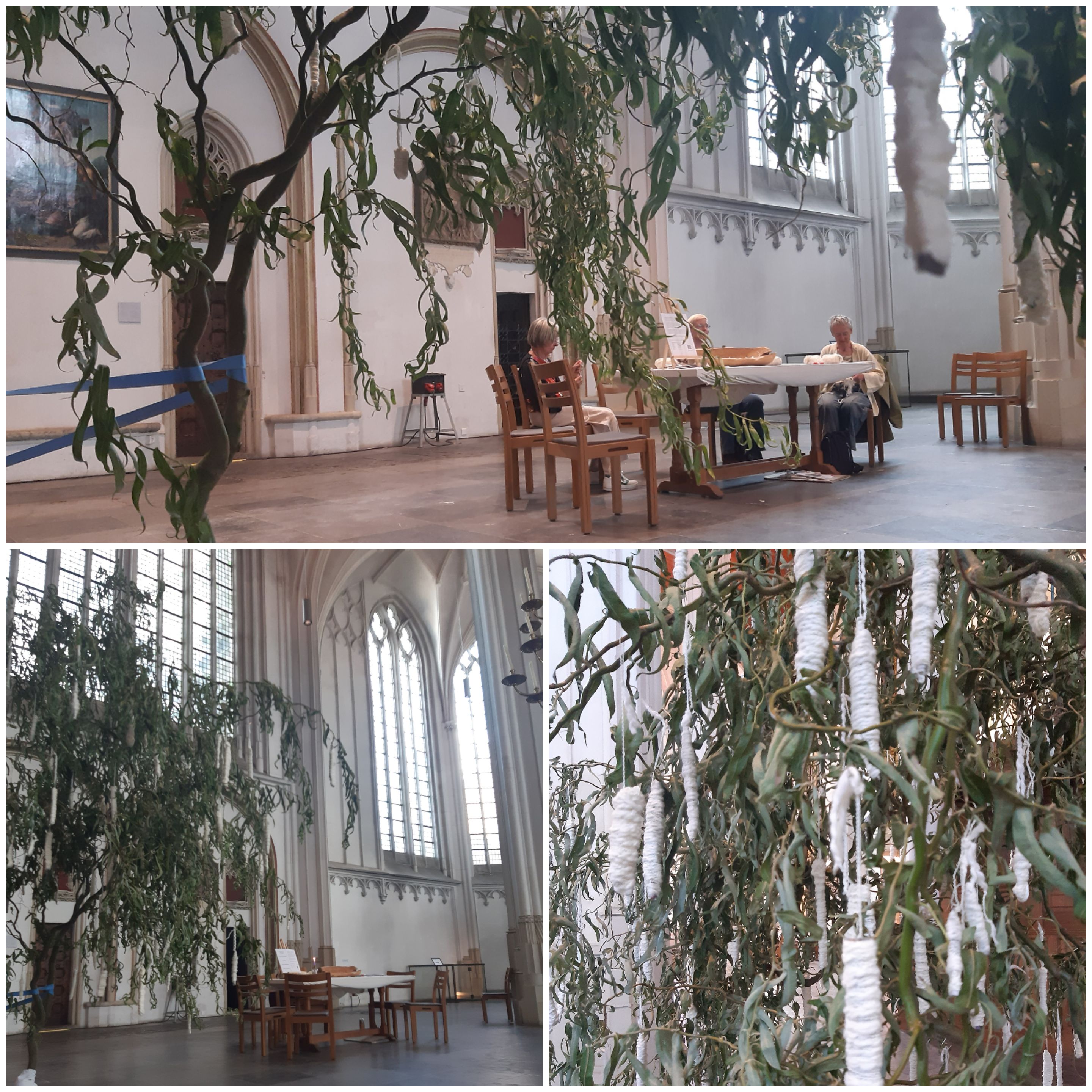 Anja kwam elke dag. Via haar sangha had ze van het project gehoord. De sommige dagen bleef ze uren en maakte liefdevol cocon na cocon, een andere dag kwam ze even kort om een kleine bijdrage te leveren aan de gestaag groeiende boom. Op de laatste dag hielp ze me bij de drukte, legde bezoekers uit hoe ze konden meedoen. Kleine dagelijks hulp die voelde als een warme doorgeeflijn.